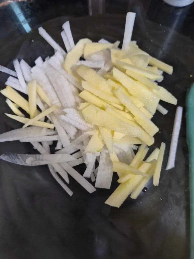사과를무생채 만들때 넣어주면 풍미도 잡아주고 감미료는 줄일수 있어서 훨씬더 건강하고맛있게 먹을수 있어요. 사과와 무는 1:2비율로 넣어주면 좋아요. 사과대신 배는 넣어주면 오히려 혈당이 많이 상승할수 있어요.
