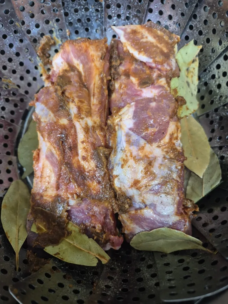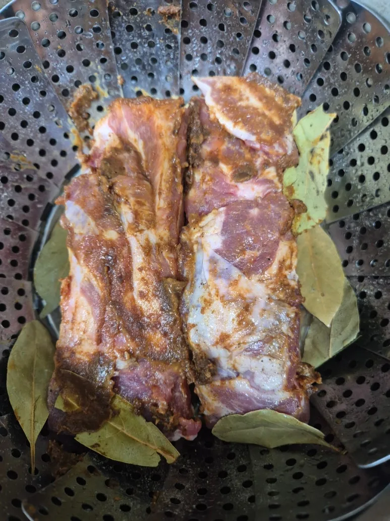 압력밥솥에 물을 넣고, 채반 위에 고기를 올린다.