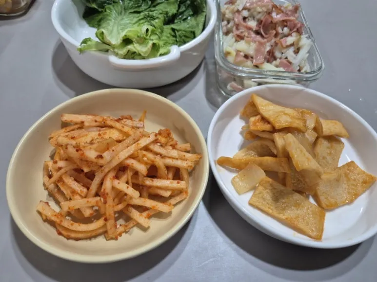 같은 양을 먹었을때, 사과는 혈당이 많이 오르지 않아서 무침류에다가 넣어서 사용하기 좋아요.