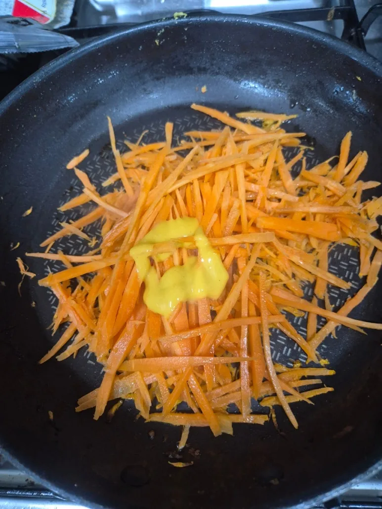 당근은 채썰어서 저당 머스타드와 애플사이다비니거, 오일 조금 넣고 볶아주었습니다.