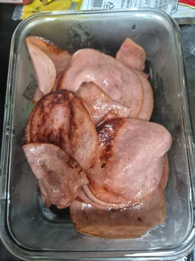 오리훈제햄입니다. 베이컨, 일반 햄보다는 나트륨 함량이 같은양일때 1/4정도가 낮습니다.그리고 오리 기름은 몸속에 좋은 지방이라고 하니 이왕이면 햄을 이용할때는 훈제오리햄을 추천 드립니다. 닭고기 햄은 맛도 식감도 제가 생각한 것과는 달랐어요.