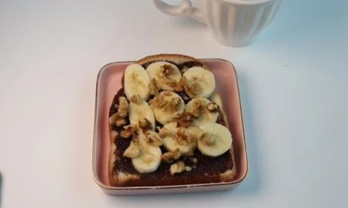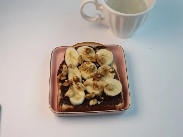 2. 식빵은 1장 40~50g내외에 녹여진 다크초컬렛을 발라주고, 바나나 1/2개 60g을 잘라서 올려준ㄷ. 호두도 잘게 잘라준다. 음료는 애플사이다 비니거에 물을 타고 얼음 넣어서 함께 먹는다.