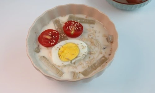 시판 콩물을 이용하고 , 면은 현미면 65g을 일반 소면 보다 5분 정도 더 삶아준다. 면류의 양은 줄이고, 우무80g잘라서 함께 먹고, 계란, 토마토의 고명과 , 식품 성분표를 보고 나트륨 함량이 낮은 소세지핫바 1개를 추가하여 함께 먹는다.
