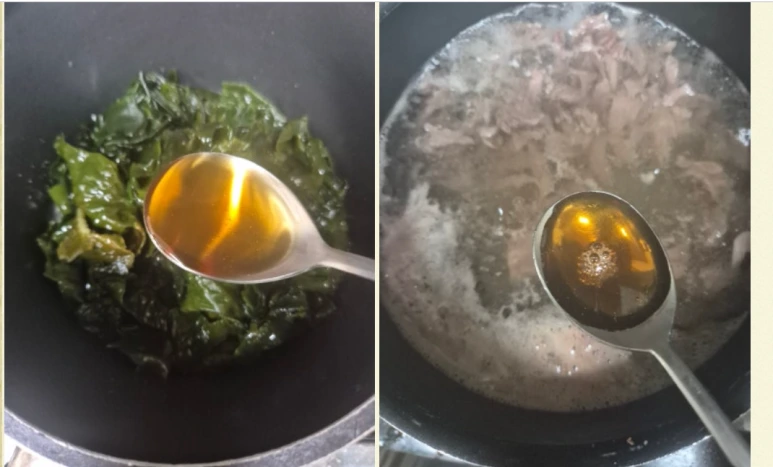 고기는 찢어주고, 고기 삶아서 걸러진 육수를 사용하고 볶아진 미역을 넣고 15분 정도 끓여준다.