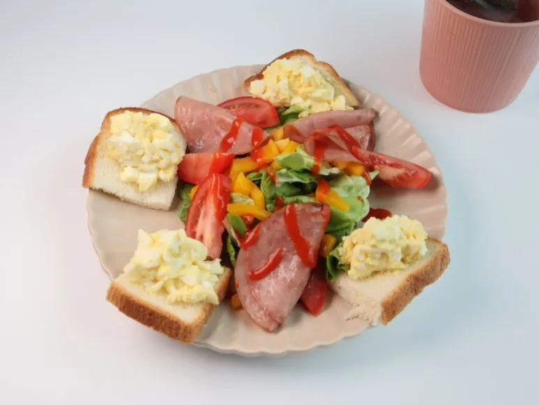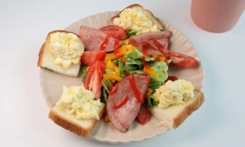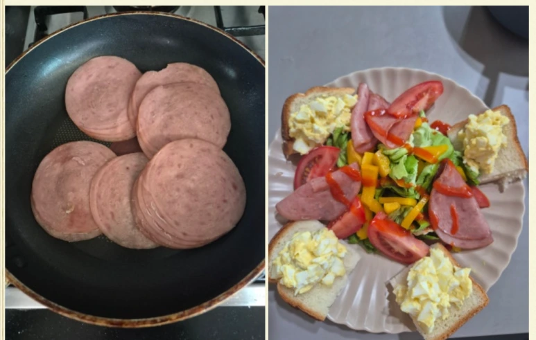 훈제오리햄을 굽고 , 샐러드야채, 파프리카 손질해서 함께 먹고, 식빵은 1쪽을 잘라서 계란샐러드를 올려준다.