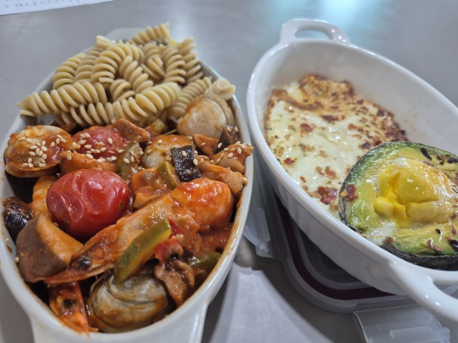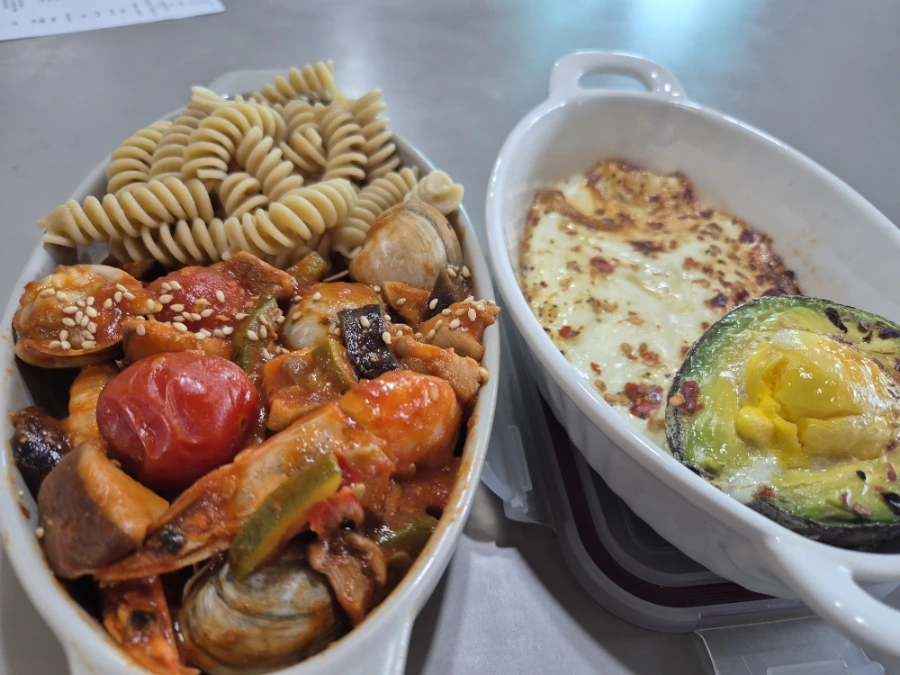 일반 적인 라따뚜이는 채소들만 들어간 형태이다 보니 새우와 동죽 조개가 있어서 단백질을 추가하고, 아보카도 계란구이를 더해서 포만감을 더해주었어요.