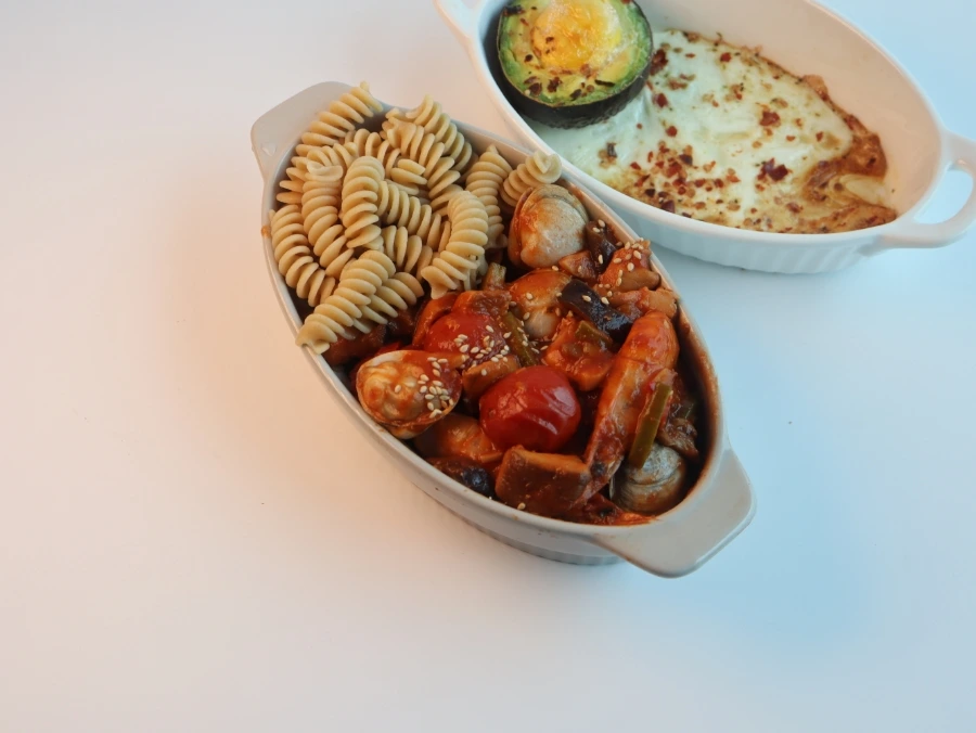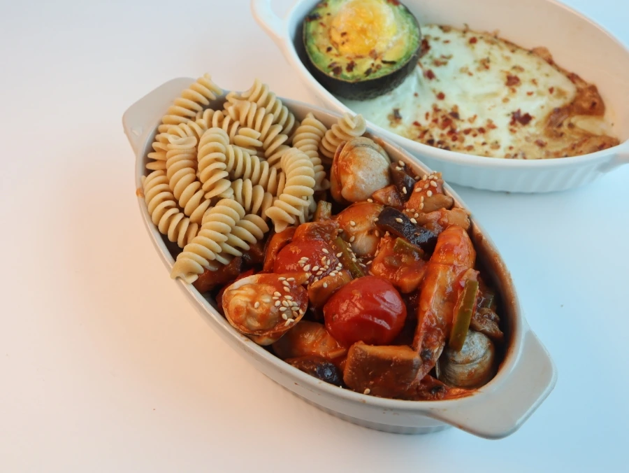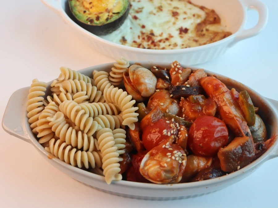 재료: 통밀 파스타 40g, 새우 4마리, 동죽 20마리, 스파게티 소스 70mL, 하프케찹 2T, 물 50mL, 해바라기씨 또는 올리브유 1T, 애호박 30g, 가지 30g, 방울토마토 50g.