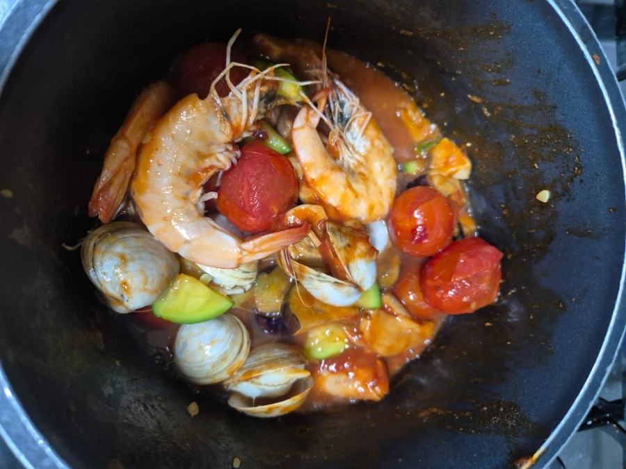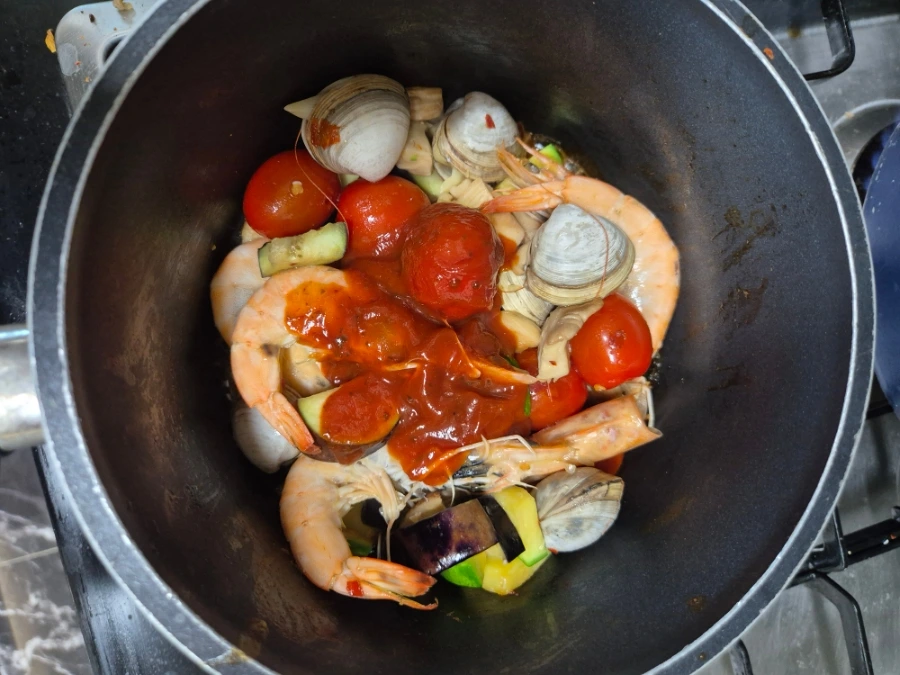 일반적인 라따뚜이는 채소만 들어가지만, 단백질을 추가하기 위해 새우와 동죽 조개를 넣었다.