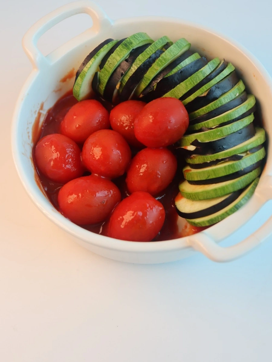 저는 라따뚜이 파스타로 먹고, 라따뚜이를 신랑이 좋아해서 야채만 넣고 미리 만들어 놓았어요.야채만 미리 잘라서차곡 차곡 쌓아주어도 모양이 예쁘게 나오더라구요. 라따뚜이 형태는 그릇째 담아서 170도에서 25분 정도로 에어프라이어로 구워줍니다.