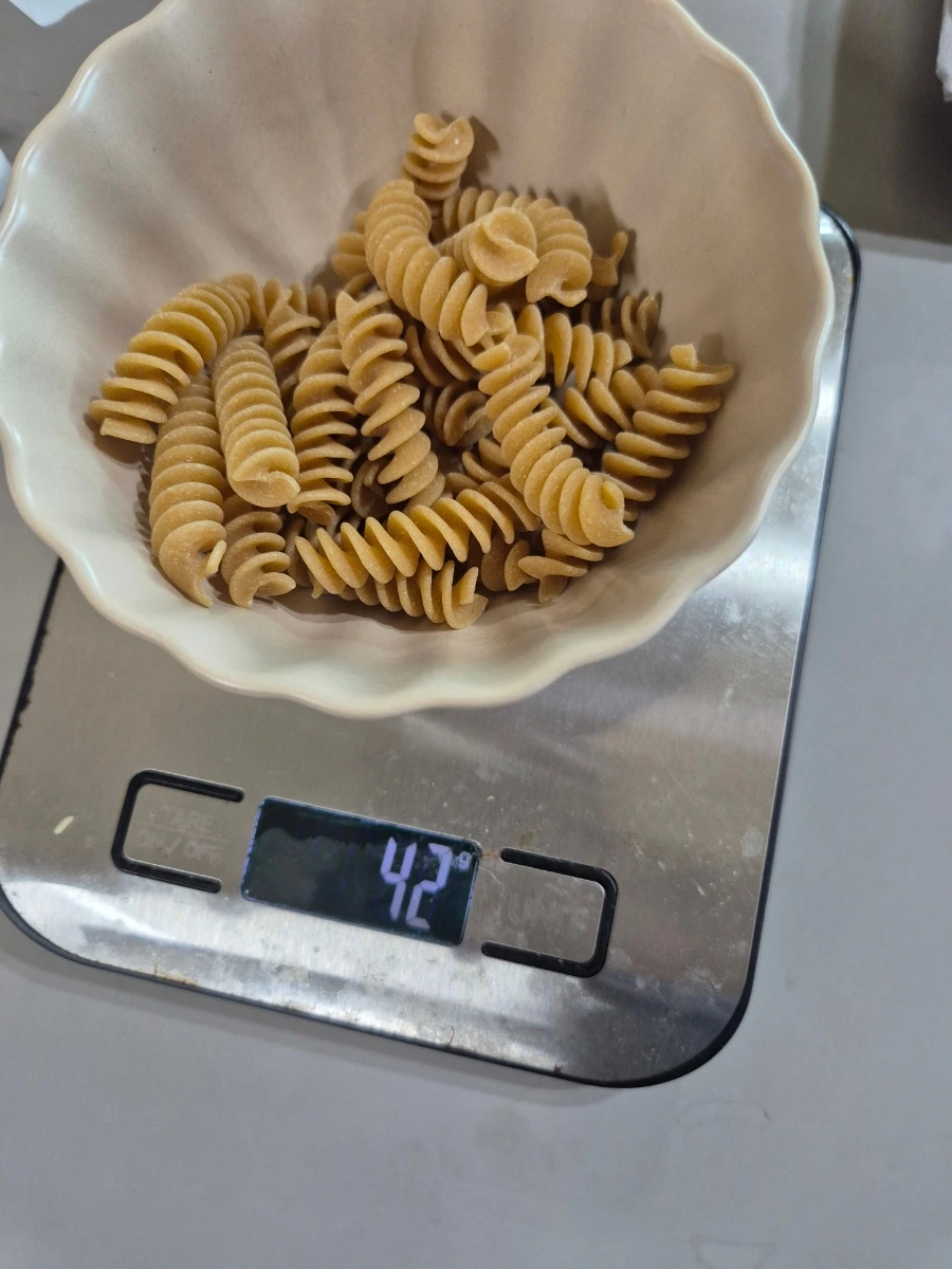 통밀 파스타를 이용하였음에도 생각보다 탄수화물 함량이 100g정도면 밥 한그릇과 비슷할 만큼이 됩니다. 저는 보통 70~80g 정도의 밥을 먹고 일반 햇반 잡곡밥 기준 24g정도의 탄수화물이 포함되어 있더라구요. 식품 성분표를 이용하여 평소 먹는 밥양 기준에 비슷한 탄수화물 양을 먹는다고 생각하고 양을 정하면 좋아요.