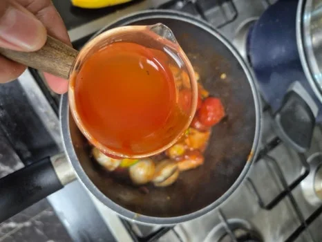 방울토마토, 애호박, 가지를 먹기 좋게 잘라서 넣고 소스 재료를 넣고 끓인다.