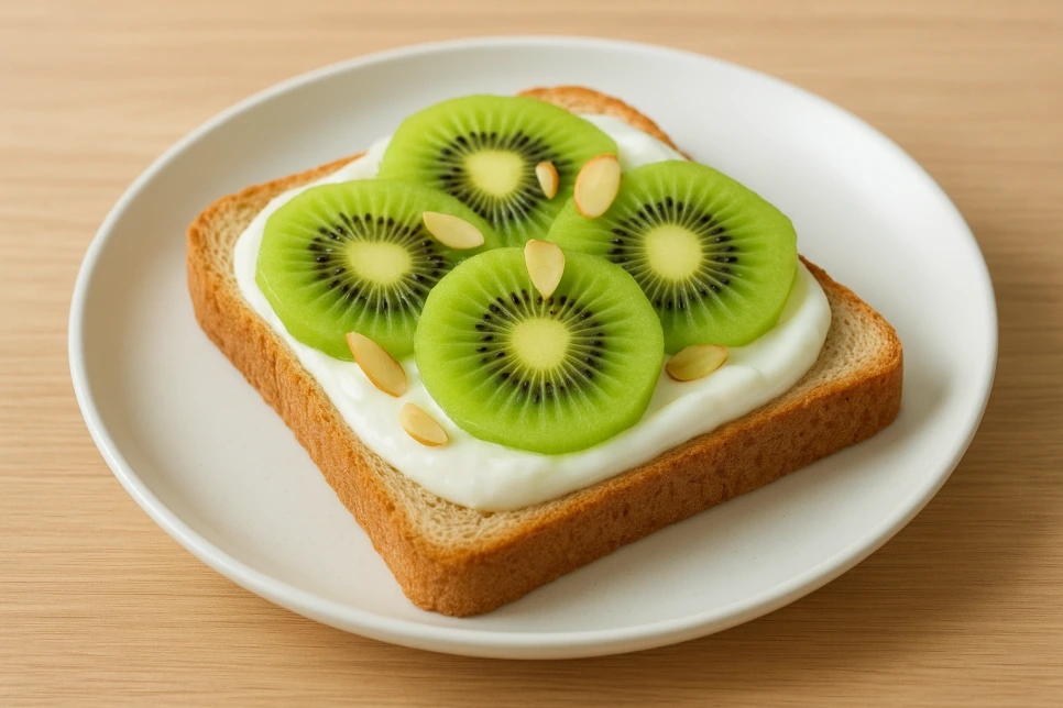 식빵을 토스트한 뒤 무가당 그릭요거트를 바르고, 꿀은 기호에 따라 0.5큰술 정도만 소량 사용하세요요. 키위는 반 개를 얇게 썰어 올리면 좋아요. 호두와.다크초컬렛은 다져줍니다