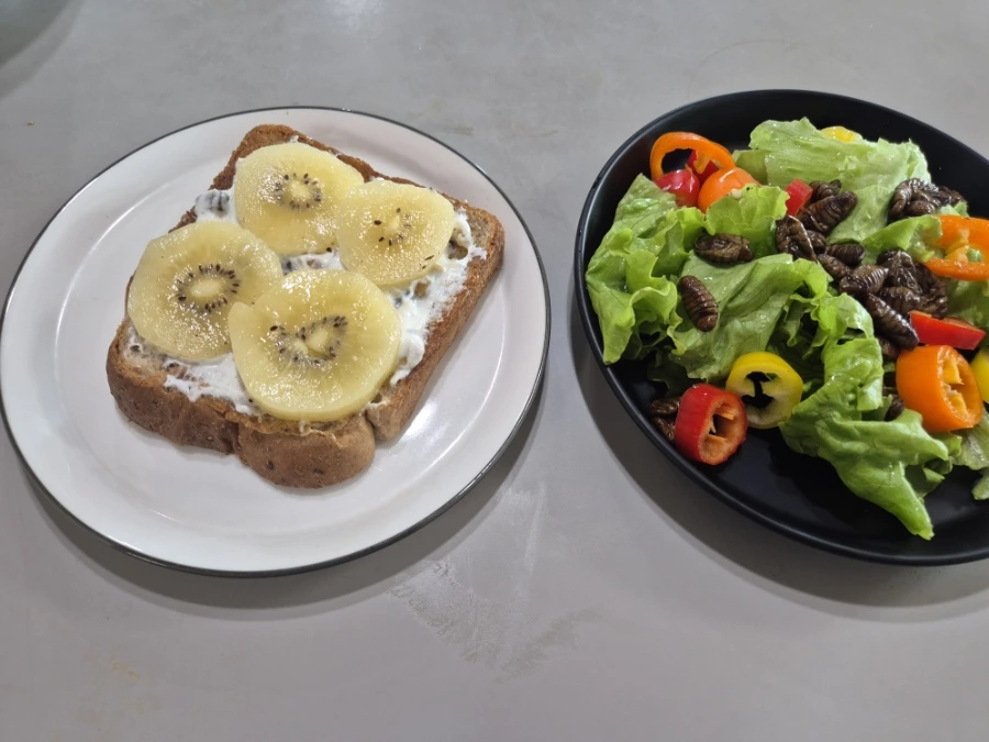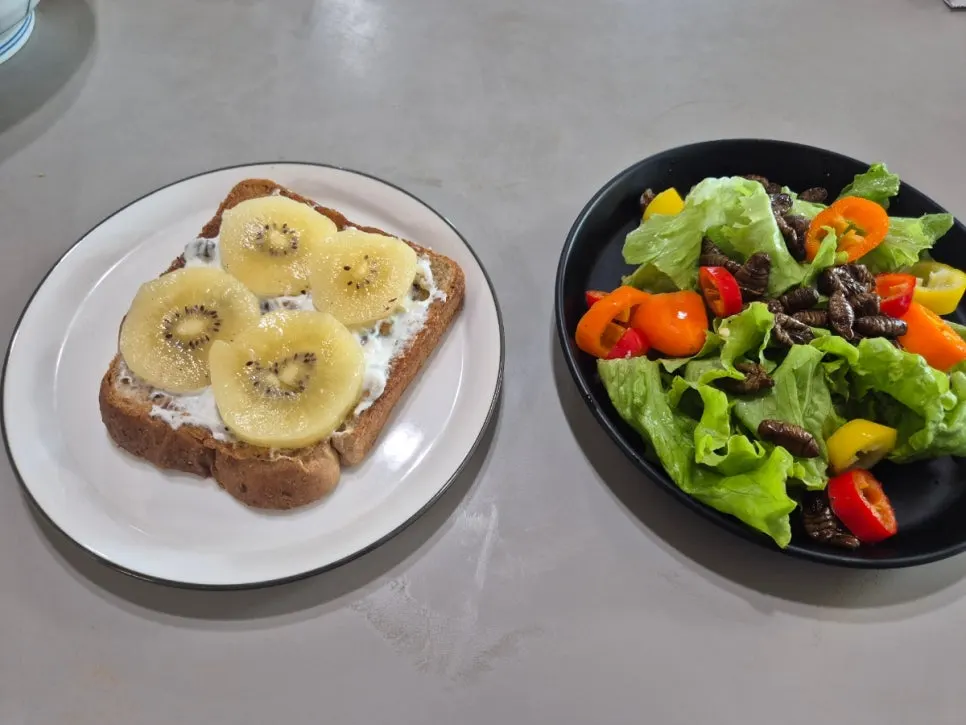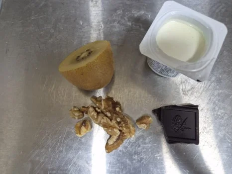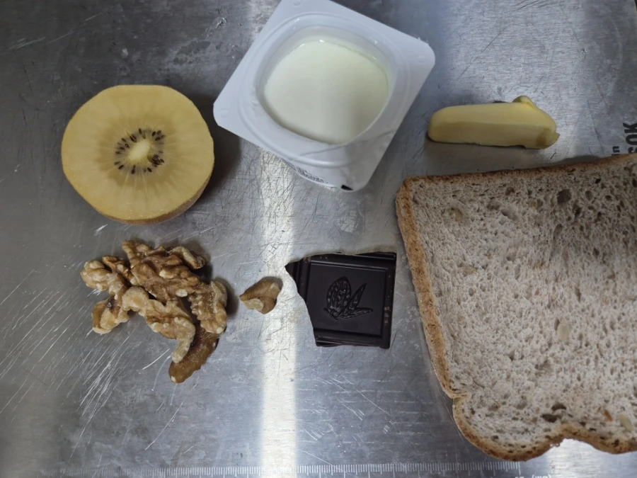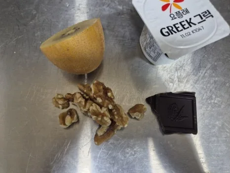 그릭요거트 100g, 통밀 토스트 1 장, 호두10g, 90%다크초컬렛 키위 1/2개(80g), 무가염 버터 5g,