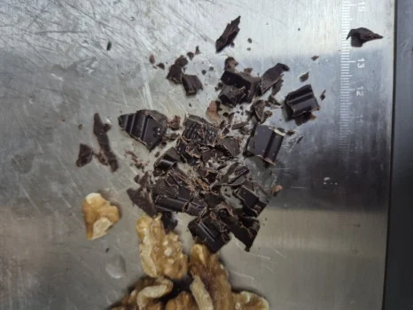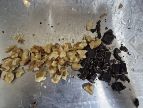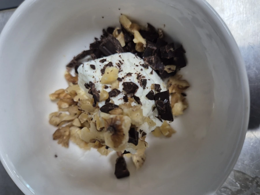 호두 10g과 다크초콜릿 10g을 잘게 다진 뒤, 그릭요거트(또는 무가당 요플레)에 넣고 고루 섞어줍니다.