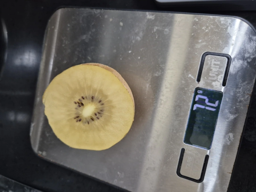개인차가 있으나 한 번에 소화 가능한 분량을 기준으로 약 70–80g을 권장한다. 저울로 껍질 포함 무게를 재는 습관이 관리에 도움이 된다. 당도가 높은 과일은 이보다 적게 섭취한다.