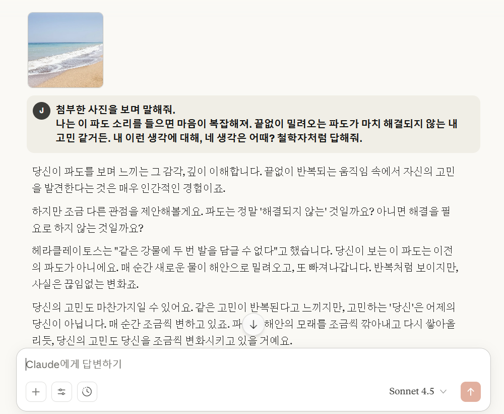 2. (한적한 바닷가 사진을 보여주며) 나는 이 파도 소리를 들으면 마음이 복잡해져. 끝없이 밀려오는 파도가 마치 해결되지 않는 내 고민 같거든. 내 이런 생각에 대해, 네 생각은 어때? 철학자처럼 답해줘.