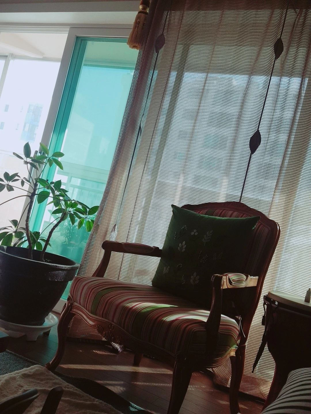 거실을 빛냈던 사랑스러운 의자가 이제는 방 한구석만을 차지하게 되어버렸다. 몇 년 전 3인용 초록색 면 소파를 샀다. 8년 동안 함께 한 회색 면 소파가 지겹기도 하고 낡았다고 생각해서 바꾸고 싶었다. 하지만, 회색 소파를 침대로 쓰고 있던 남편이 버리는 것을 고사하고 나선 것이다. 사실 덩치가 커서 버리는 것도 만만치 않다는 것도 한몫을 했지만 말이다. 새것도 품고 낡은 것도 품어버린 거실은 이미 3인용 소파 2개로 제 역할을 다 해버렸다. 남편과 나는 3인용 소파 하나씩을 꽤 차고 있는 셈이다. 참 넓고 좋긴 하지만 사랑하는 암체어를 둘 곳이 없다. 자연적으로 방 한구석으로 비집고 들어갈 수밖에.