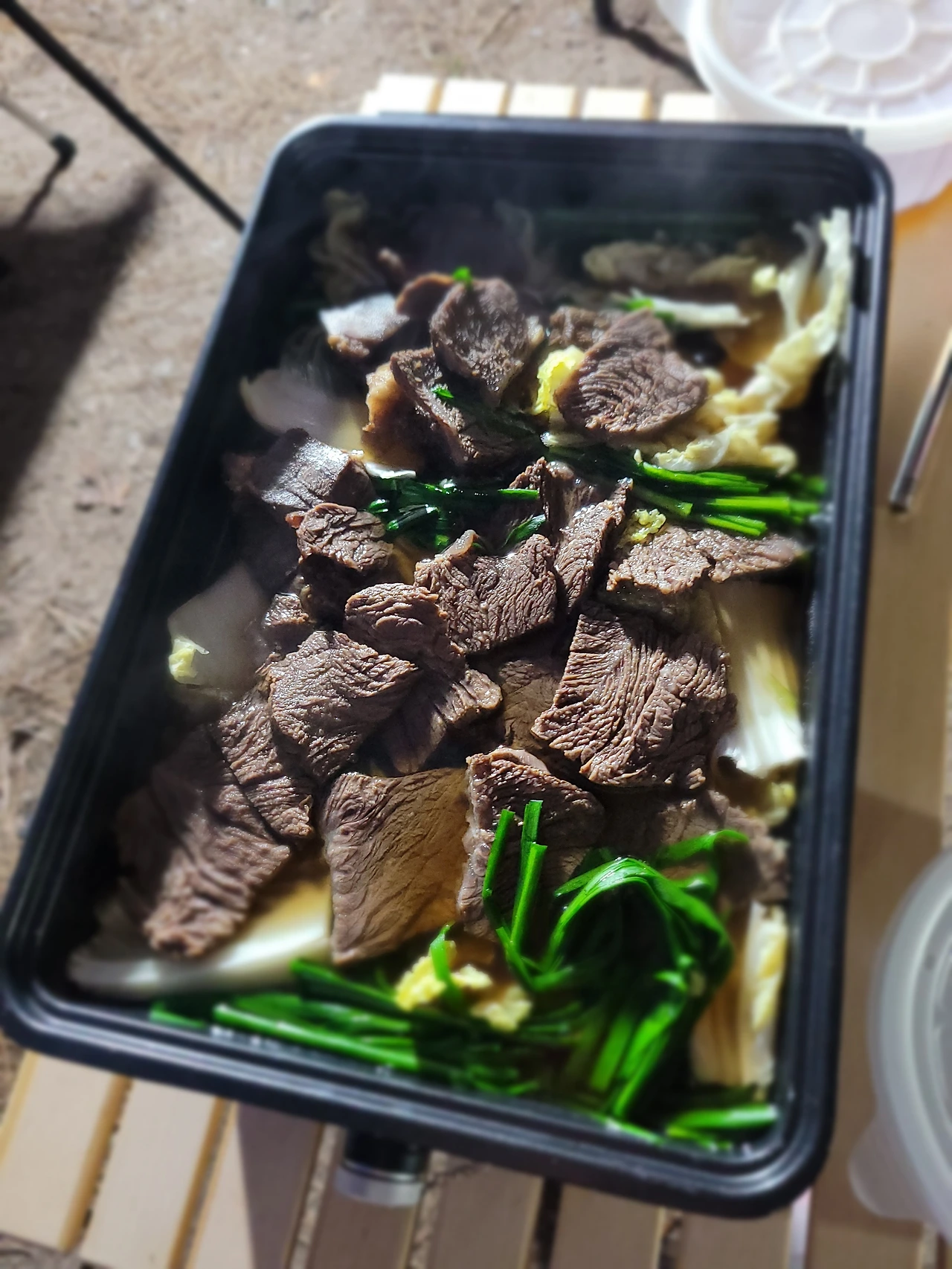 그래도 우린 늘 해낸다. 잘 해낸다. 시간이 걸릴 뿐이다. 낮은 직사각형 코펠에 미리 준비한 육수, 슬라이스 한 수육과 노란 알배추와 초록의 부추를 한꺼번에 밀어 넣는다. 유자 폰즈 소스에 푹 찍어 먹으니 담백한 사태의 맛과 달짝한 배추내음 사이를 비집고 들어오는 유자향이 향긋하다.