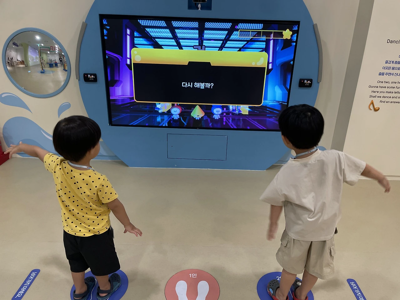 우리가 잘 아는 “즐겁게 춤을 추다가 그대로 멈춰라!” 노래에 맞춰 춤을 추다가 화면에 나오는 한글을 몸으로 표현해 맞추는 것이다. 일단 엉덩이 흔드는 걸 좋아하는 훤이는 자신의 ID카드를 찍어서 나온 자기 캐릭터가 춤추는 게 재밌다고 여겼다. 사진처럼 2인도 가능