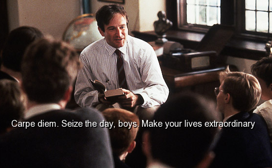 라틴어 카르페 디엠(carpe diem)은 ‘오늘을 붙들라’(seize the day)라는 의미이다. 이 말은 로마 시인 호라티우스(Horace)의 서정시집 ‘오데스’(Odes, 23 B.C.) 중에 나오는 금언(金言)의 일부이다: “오늘을 붙들라. 내일은 가능한 한 믿지 말라.”(carpe diem quam minimum credula postero)