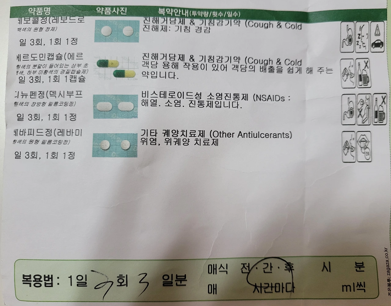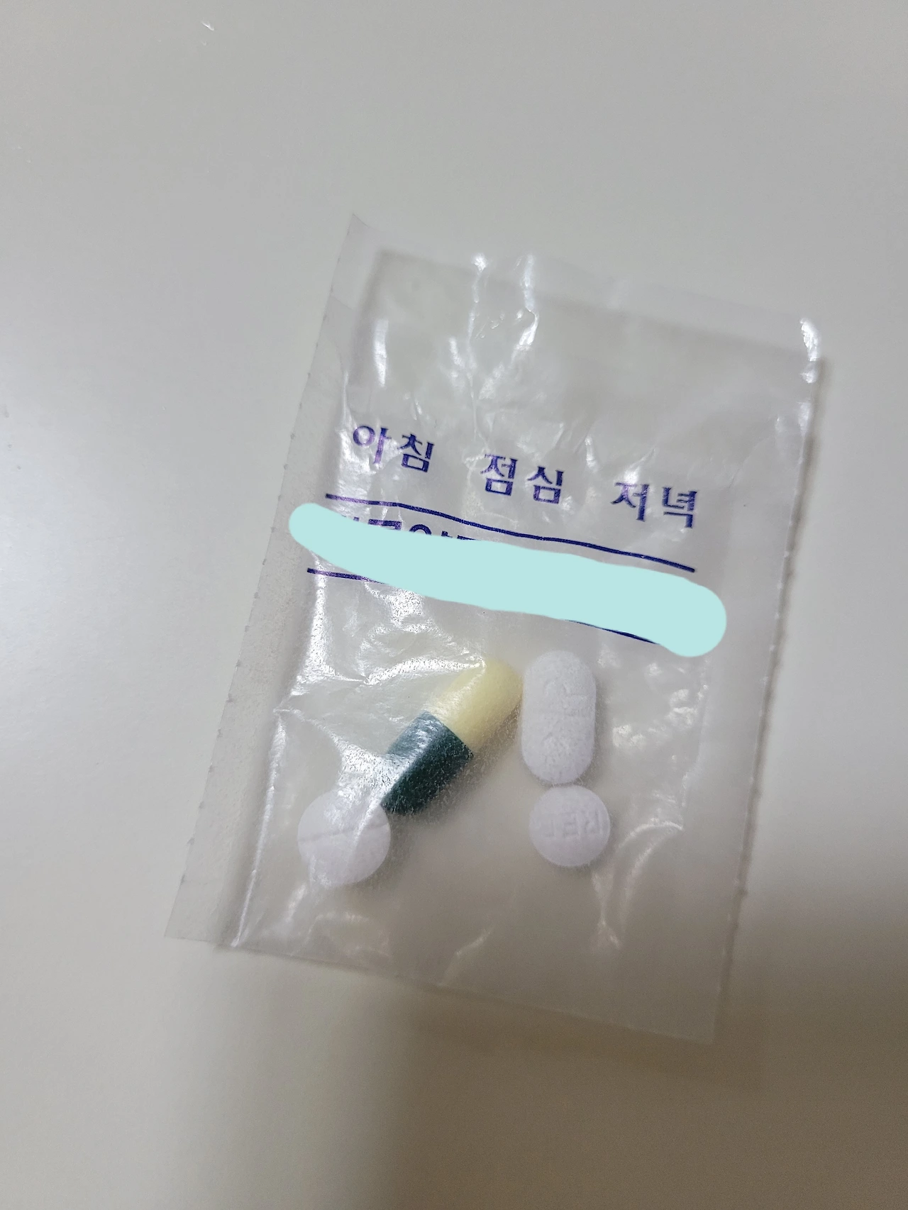 한 봉지에 알약이 4개가 담겨 있다. 진해거담제&기침감기약 2알, 소염진통제 1알, 궤양치료제 1알이다.