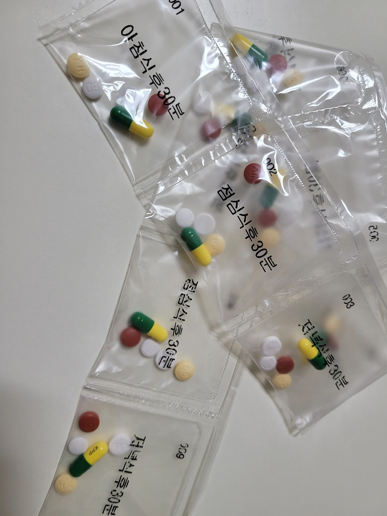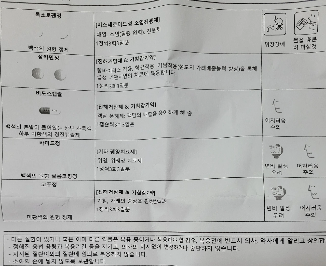 알약이 한 봉지에 다섯 알씩 담겨있다. 소염진통제 한알 진해거담제&기침감기약 세알, 기타 귀양치료제 한알로 구성되어 있다.