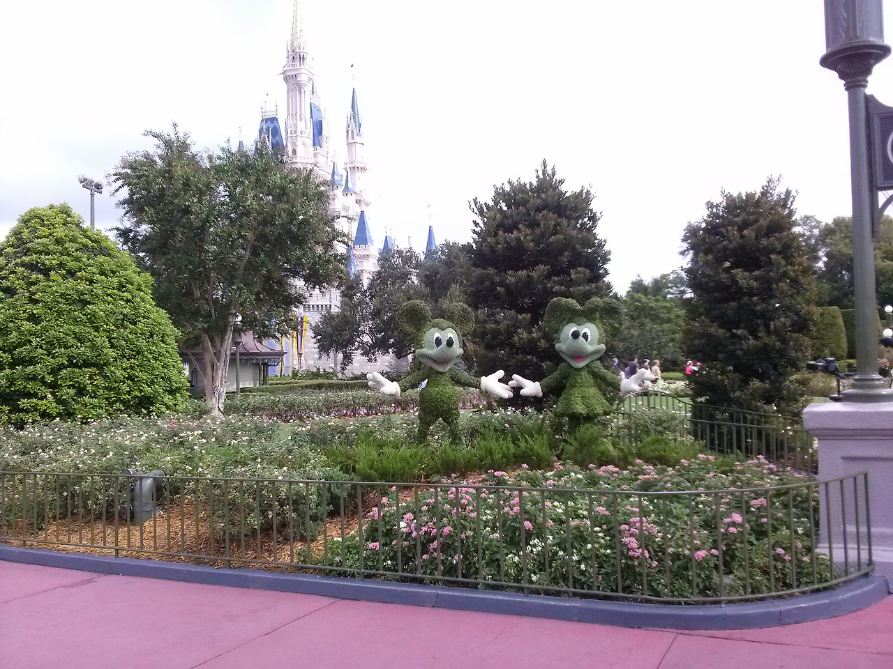 방문객들을 환영하듯 두 팔을 벌리고 서있는 디즈니월드 매직킹덤의 미키와 미니