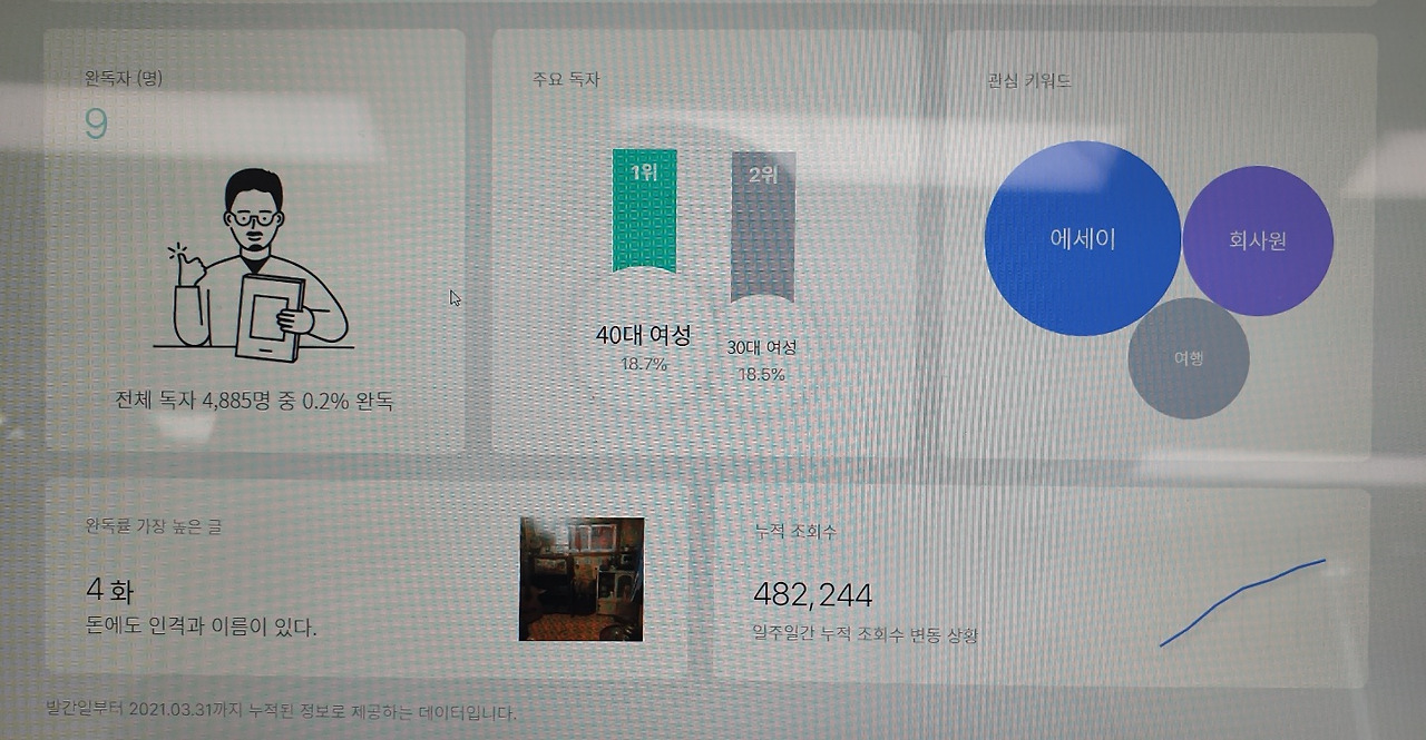 즉, 메인 노출과 주요 관심으로 많은 조회수를 얻어도 알고 싶은 정보만 보고 가시는 분들이 많다는 뜻이다. 반면에 에세이는 브런치에서 작가로 활동하시는 분들이 사랑해주시는 경우가 많기에 완독률이 높다.