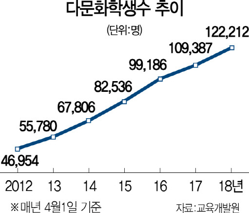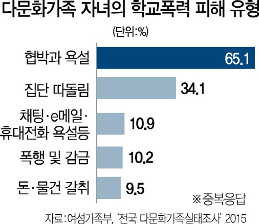 여성가족부가 2018년 발표한 ‘전국 다문화가족 실태조사’에 따르며 다문화 가족 자녀가 차별을 경험한 비율이 9.2%로 2014년 6.9%에 비교해 2.3% 증가했고, 다문화 가족 자녀들은 친구에게 64%, 고용주 또는 직장동료에게 28% 차별을 받은 것으로 나타났다. 또한 학교폭력을 경험한 자녀는 2015년 5%에서 2018년에는 8.2%로 3.2% 포인트 증가했으며 더욱 문제가 되는 부분은 학교폭력을 받은 다문화 가족 자녀 중 48.6%가 그냥 넘어간다고 답하였다. 아래 그림을 보면 세부적인 다문화가족 자녀의 학교폭력 피해 유형 결과에 대해서 확인할 수 있다.