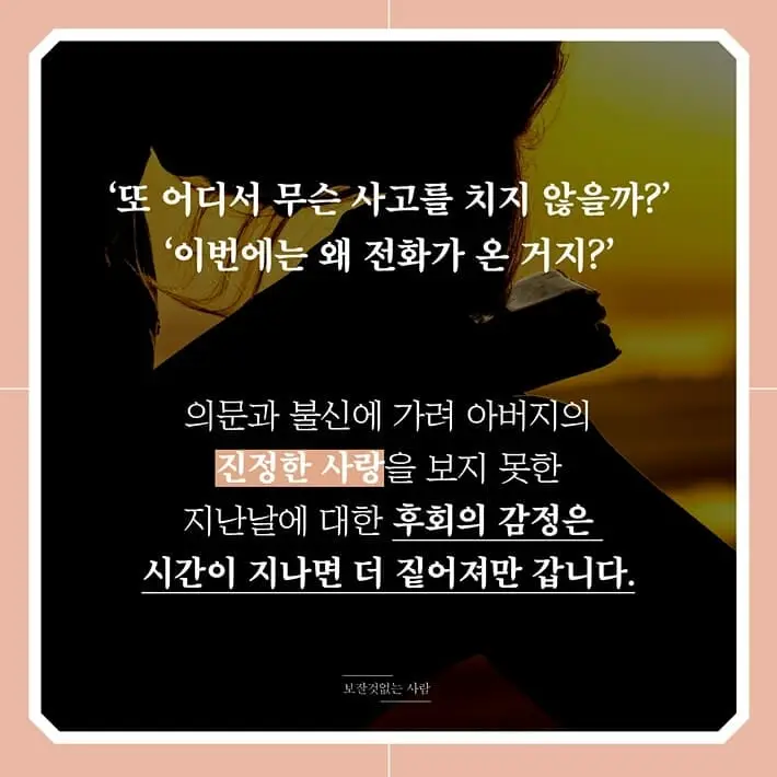 책을 읽는 입장에서 한 가장의 수많은 잘못에 감정이 이입될 수도 있고 어쩌면 자식이 책을 통해 용서를 하는 글들이 억지처럼 느껴질 수도 있다. 그리고 부모에 대한 원망을 한 번이라도 해보았다면 자신의 부모와 책 속에 부모를 비교하며 다시 한번 생각에 잠기게 될 것이다.