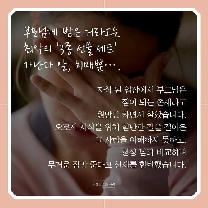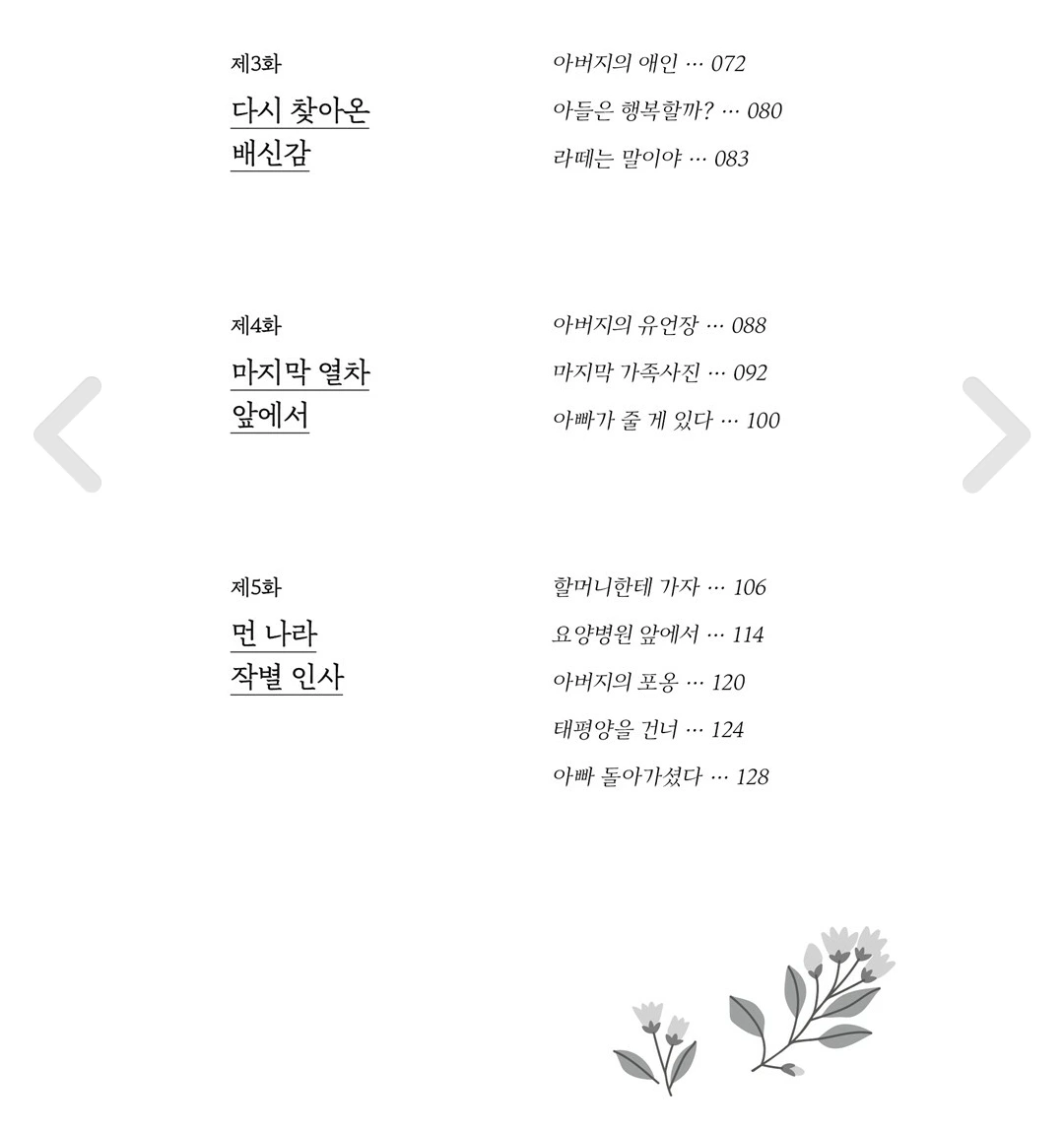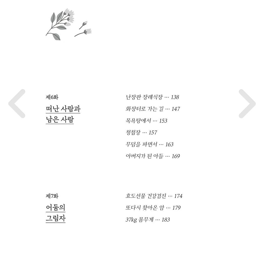 이 책은 6년간의 기록을 바탕으로 쓰였다. 자식 입장에서 부모님을 생각하며 쓰였지만 행복한 감정만을 다루고 있지는 않다. 어쩌면 다소 불편할 수 없는 내용들이 숨어 있지만 그 불편함은 저자만 경험한 특별한 일이 아니라는 사실은 책을 읽는 동안 독자들에게 치유에 시간이 된다.