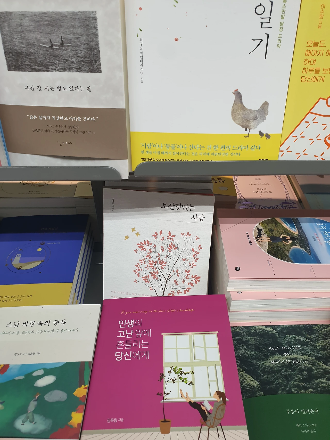 돌아가서 다시 한번 천천히 둘러보았다. 그리고 매대 안쪽에 보이지 않게 쌓여있는 4권의 내 책을 찾았다. 순간 저자인 내 눈에도 보이지 않는 책이 다른 사람 눈에 보이는 것은 불가능하다는 것을 깨닫고 허망한 마음으로 책을 바라보았다.