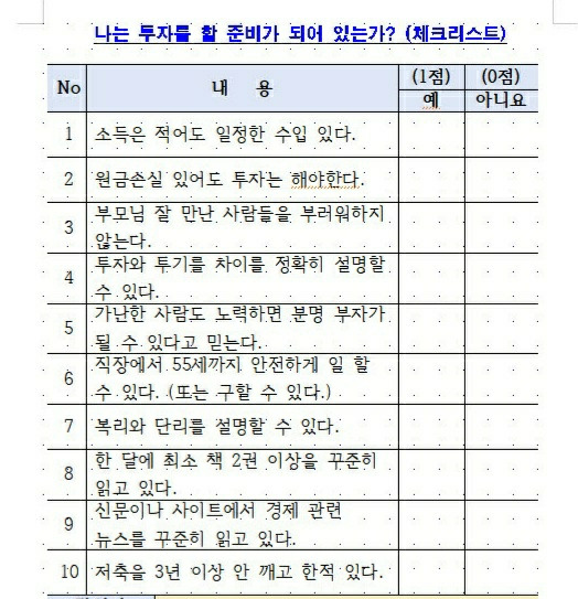 <당신은 투자 할 준비가 되었는가?> 체크리스트는 투자를 하기 앞서 기본적인 마인드를 간단하게 진단하는 목적으로 문항을 구성해보았다. 척도를 단순화 시켜서 점수 계산을 단순하게 했다. 물론 검증되거나 점수의 결과에 대한 진단에 대한 타당성 조사나 그런 것은 진행하지 되지 않았다.