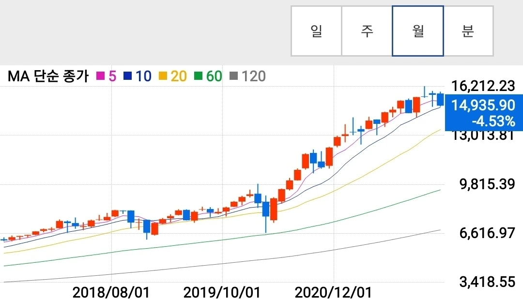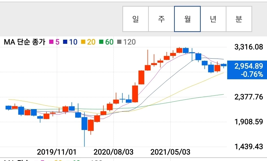 위 2개의 차트는 코스피와 나스닥의 월봉 차트이다. 어떤 주식의 흐름을 보였는지 보여준다. 2021년에 한국 주식과 해외주식을 투자할 때 최대한 종목을 오래 보유하는 것에 목적을 두었다.