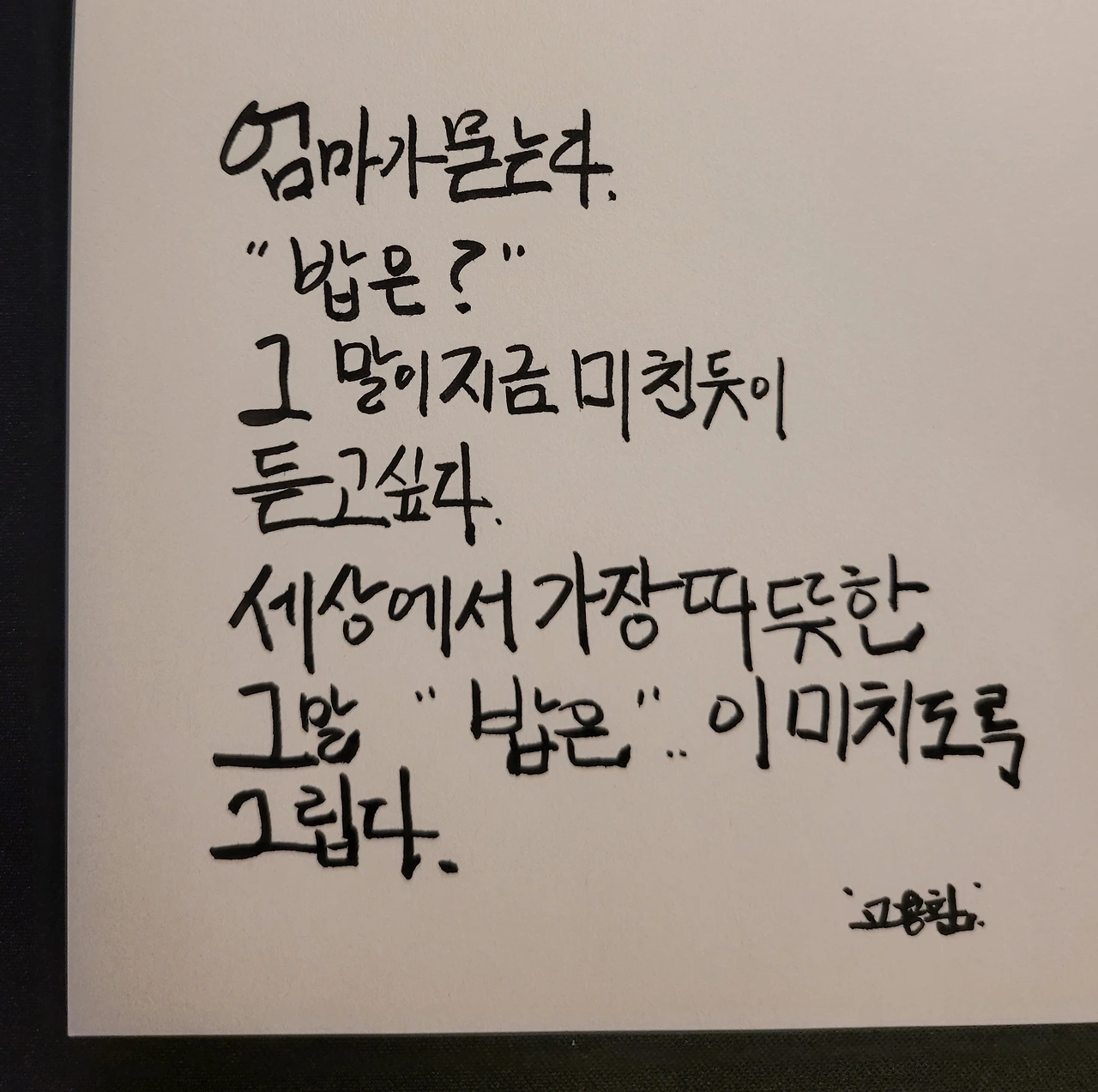 아마도 이 두 글자가 가장 그립다. 정말 우리나라 사람들의 사랑과 정성을 모두 함축한 두 단어는 '밥은'일 것이다. 20살 때부터 가난으로 어쩔 수 없이 직업군인이 된 아들이 안쓰러웠던 엄마는 내가 전화를 하면 언제나 첫마디가 '밥은'이었다.