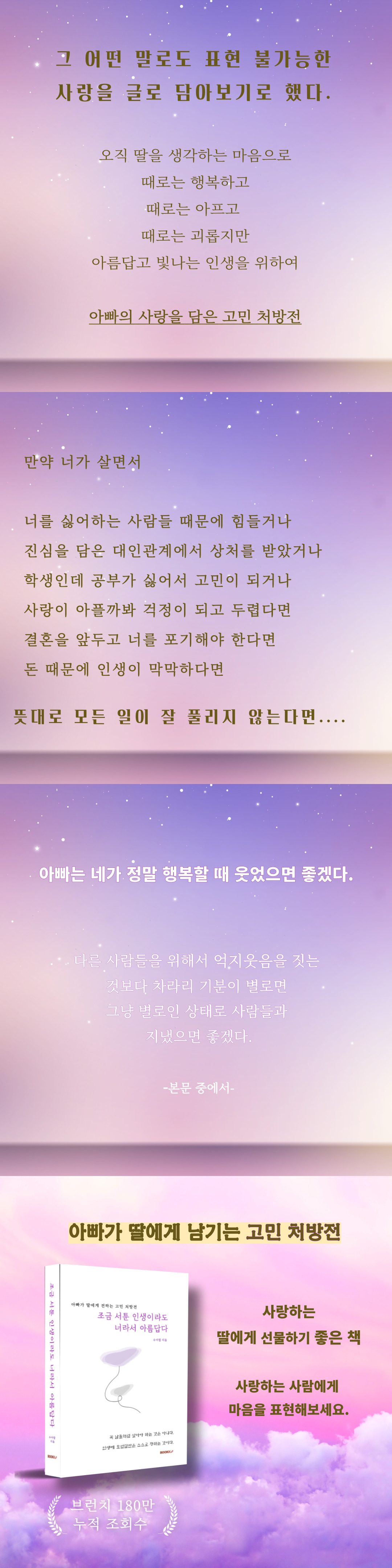 조금 서툰 아빠라서 항상 딸에게 미안 했습니다. 매일매일 자라는 딸에게 인생에 작은 도움을 주고 싶은 마...