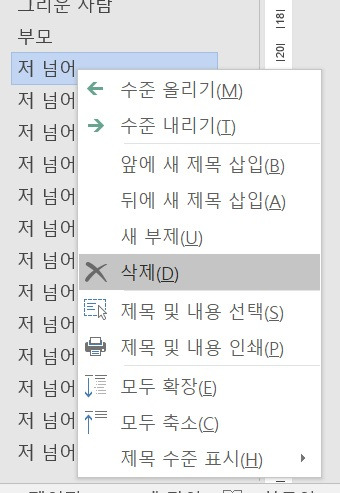 붙여 넣기는 복사해서 붙여 넣기를 반복하면 되는 것이고, 삭제는 목차를 활용하면 부분 삭제할 수 있다. 연속된 글을 삭제 시엔 기본 방식이 편하고, 목차 중에 하나를 삭제 시에는 해당 목차에서 삭제할 부분을 클릭 후 마우스 오른쪽 버튼을 이용해 삭제하기를 하면 깔끔하게 그 페이지만 사라진다. 이때도 역시 조건은 CTRL+enter다. 페이지 나누기가 되어 있을 때만 사용가능하다.