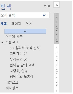 나의 [ 단편소설, 사랑을 표현하세요 ]를 예시로 들자면 본문 상에 스타일을 설정하면 오른쪽에 탐색창이 뜨면서 목차와 같은 배열로 표시된다.