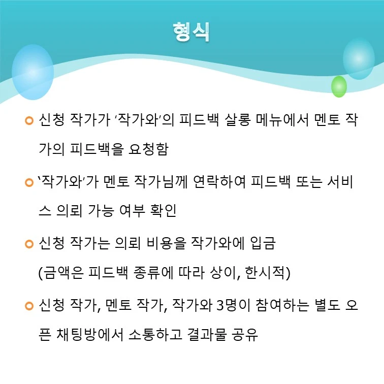 3. 신청 작가는 의뢰 비용을 작가와에 입금 (금액은 피드백 종류에 따라 상이, 한시적)