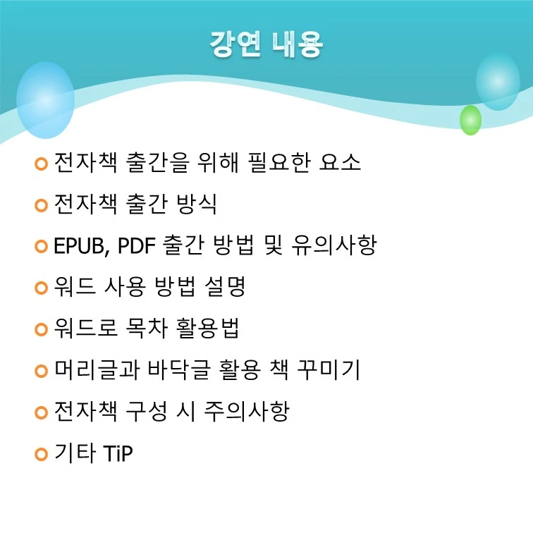 전자책 만들기는 처음만 어려울 뿐 한 번의 경험만 있으면 쉽게 따라 할 수 있다. 책 만들기에서 가장 힘든 것은 원고 작성이다. 그 외의 부수적인 것은 경험과 노하우만 생기면 누구나 할 수 있다. 누군가 내게 다시 전자책 만들기를 설명해달라고 한다면 나는 이번에도 OK를 할 것 같다. 내 말에 사람들의 끄덕임이 즐거웠다. 비록 중간에 실수는 있었지만, 그것 조차 인정하고 넘어가다 보니 재밌는 시간이었다.