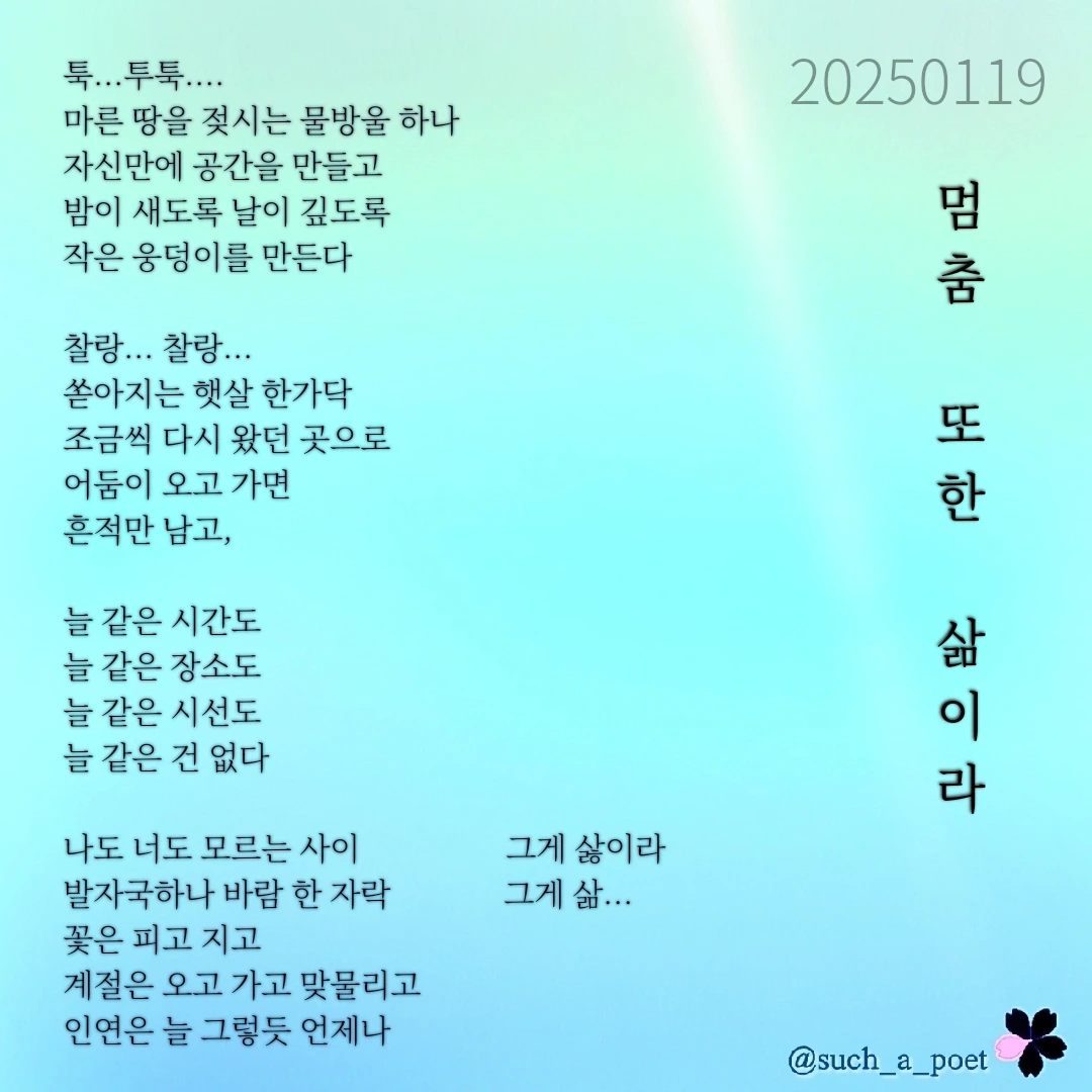 나는 비록 아무것도 하지 않지만, 변하고 있다. 깨닫는 순간이 오면 어쩔 수 없이 인정하고 받아들여야 다시 나아갈 수 있을 것이다. 오늘도 지금도 순간도 변하지 않는 것은 없다. 아주 천천히 움직이고 있을 뿐이다. 멋진 삶을 살기보단 최선을 다해 살고 싶다. 지금 나의 멈춤은 나의 최선이다.