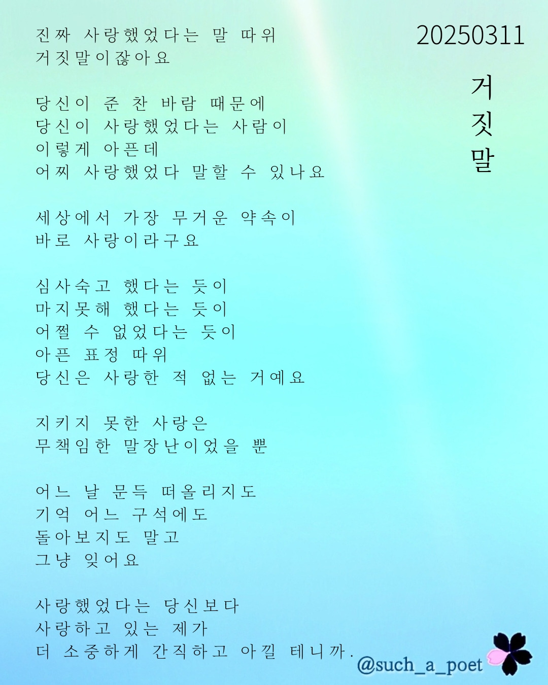 그러나 떠나는 너에게 해 줄 수 있는 마지막 사랑이라는 걸 훗날 알 수 있을 지도 모르겠네요. 아니 몰라도 됩니다. 알아 달라는 건 아니니까.