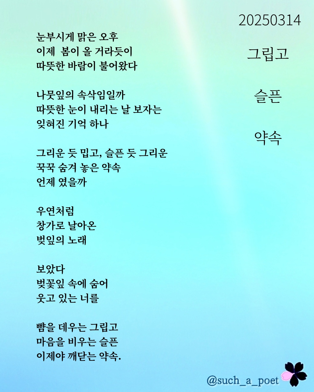 그러다 문득 떠올랐습니다. 아무것도 남아 있지 않은 사랑은 혼자서 한 약속만 남았습니다. 눈은 차갑습니다. 그러니 따뜻한 눈이라 말했습니다. 그런데 알아버렸습니다. 벚꽃이 낙화하는 날, 사람들은 따뜻한 눈이라 말했습니다. 어쩔 수 없이 풀려버린 기억은 그렇게 다시 제게 왔습니다.