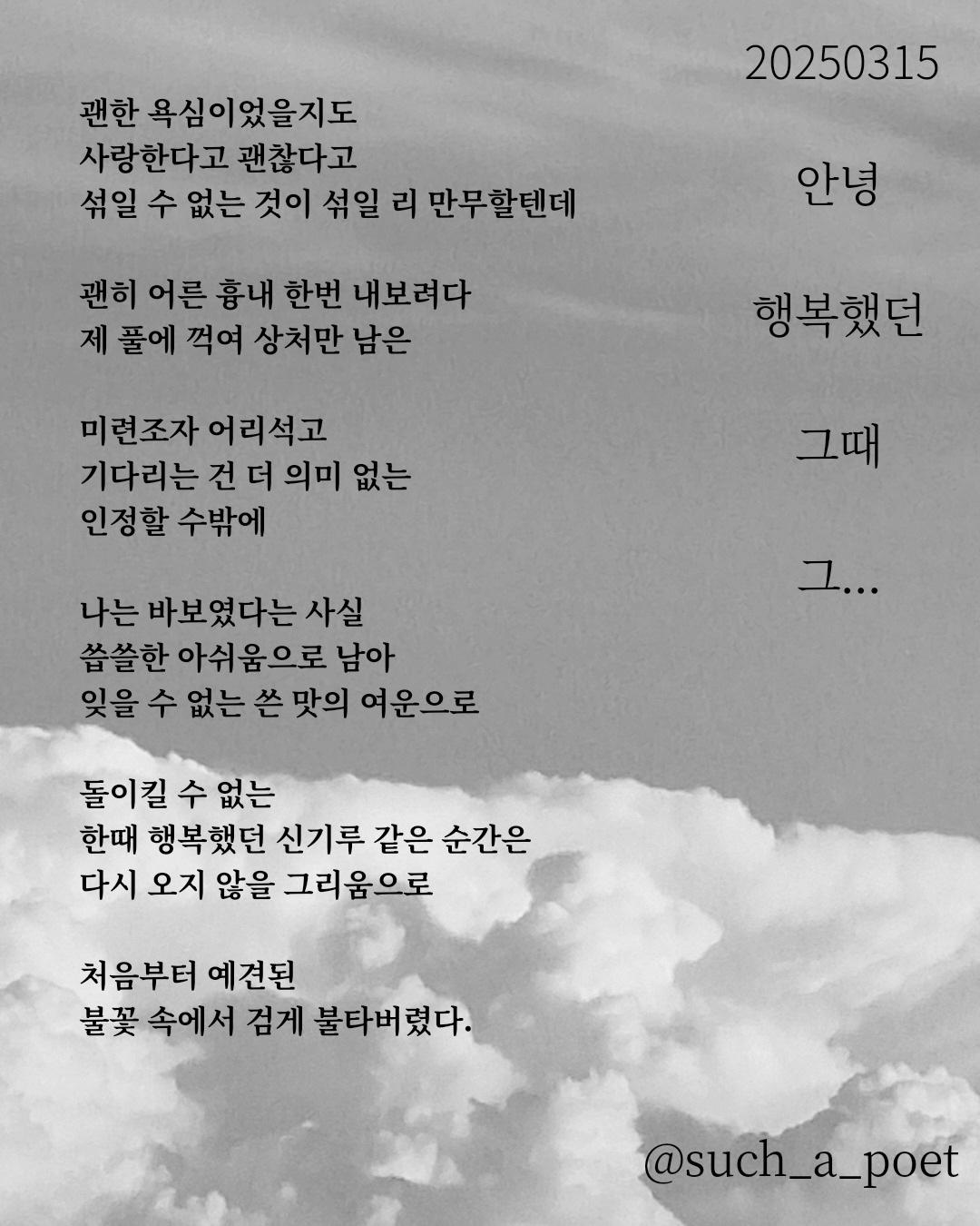 화목이라는 단어와 다소 먼 사이였던 사이. 대면대면한 사이. 먹고살기 바빴던 시기여서 더욱 그런지도 모르겠다. 각자 자기 삶이 벅차 가장 가까이 있는 존재도 모른 척 외면했었다. 어느 정도 내 자리가 생겼다 싶을 때 하나둘 새로운 울타리를 만들기 시작했고, 간혹 만나는 횟수는 어색한 사이에게 기회로 다가왔다. 그러나 처음부터 물 위에 떠 있는 기름이었던 우리가 물 위에 다시 모였다고 섞일 리가 없다. 알면서 간과한 결과는 참혹했다.