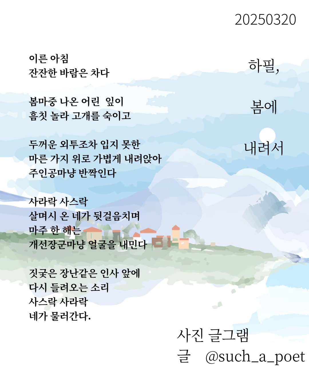 봄을 기다리는 단톡방에 대화내용을 보다 얼마 전 새벽 몰래 내린 눈이 생각났다. 기다리는 비는 안 오고, 애꿎은 눈 소식에 다시 추워질까 걱정되었다. 그러나 막상 마주한 눈을 보니 또 예쁘다. 밤 사이 몰래 옹기종기 모여 앉아 소리를 내던 눈은 아침 해와 함께 금방 사라졌다.