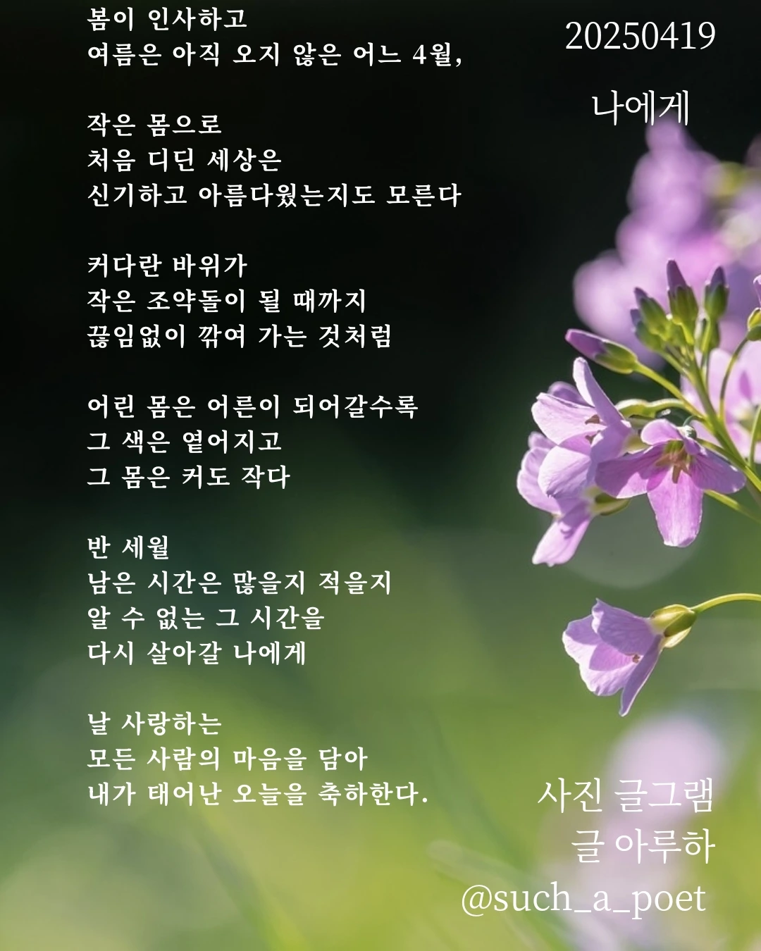 꽤 오랫동안 글을 쓰면서 날 위한 시를 써보긴 처음이다. 내 생일이라고 특별한 날이라 생각한 적도 없고, 무엇보다 올해 생일은 잊고 있었다. 희한하게 네이버 알림도 오지 않은 생일이라 솔직히 벙벙하기도 하다.