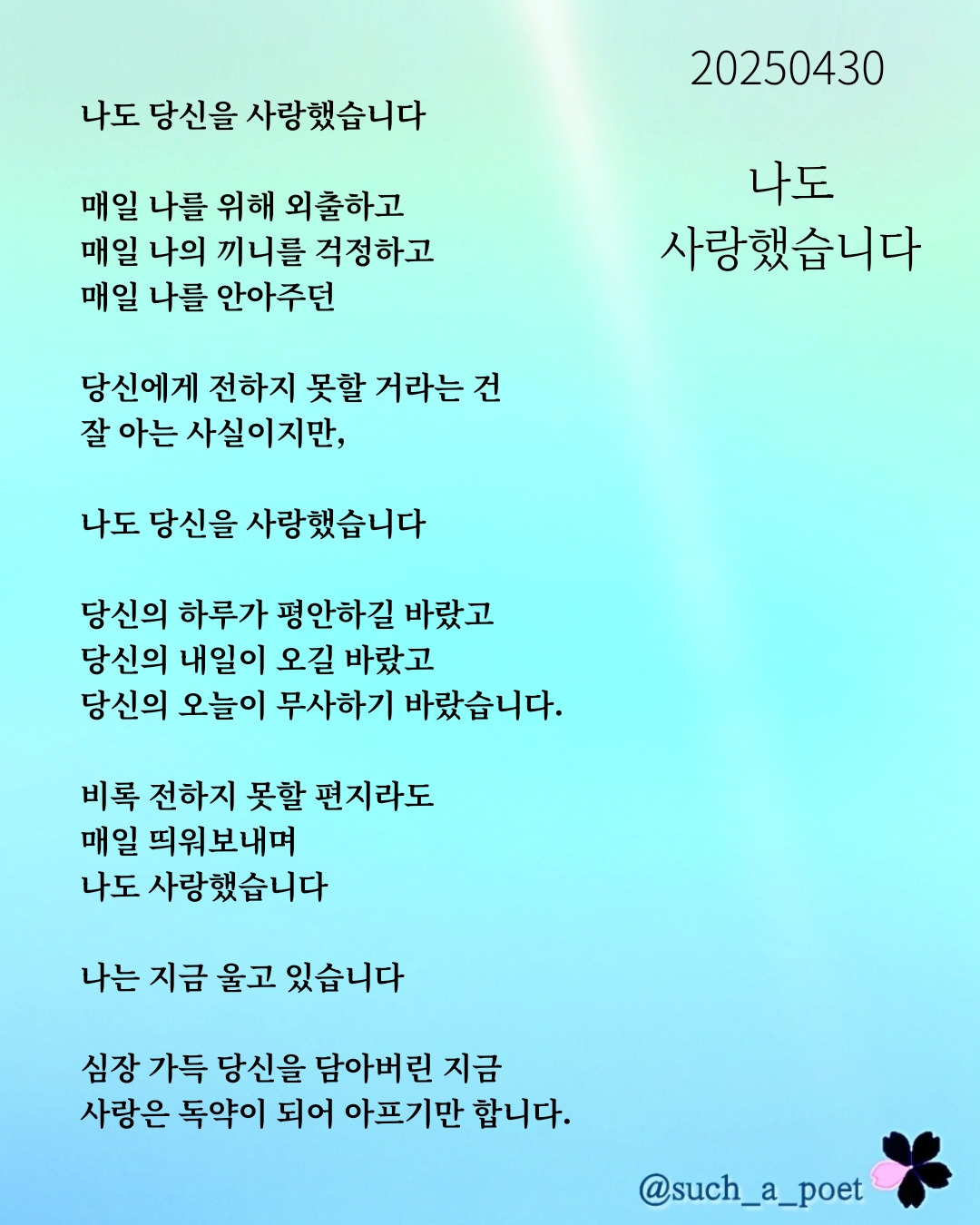 우연히 인스타를 통해 주인을 잃은 반려견의 영상을 보았다. 목이 메도록 주인을 부르는 소리가 나도 덩달아 슬퍼졌다. 오늘 글은 반려 동물의 마음을 썼다. 평생을 함께 하는 반려 동물은 주인을 먼저 보내는 경우보다 반려 동물이 먼저 보내는 경우가 많다고 들었다. 나는 반려 동물을 키워본 경험은 없지만, 주위를 보면 먼저 무지개다리를 건넌 반려동물을 그리워하는 지인들을 많이 보았다.