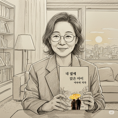 Gemini AI가 나의 모습을 예쁘게 그려줬다. 나와 전혀 닮지는 않았지만, 특징은 비슷하다. 그리고 포토샵을 할 줄 몰라 그림판으로 나름 책 제목은 겨우 입력했다. 책을 넣고 배경을 지우기를 했더니 그래도 표지에서 가장 중요하게 생각했던 소녀, 소년(수희, 진영)이 우산 안에서 나란히 걷고 있는 모습이 남았다. 우산은 수희 쪽으로 약간 기울져 있고, 전체적인 표지 이미지는 수채화적으로 자연스럽지만 우산 위로 떨어지는 빗방울을 강조해 독자로 하여금 자연스럽게 두 아이에게 시선이 가도록 유도했다.