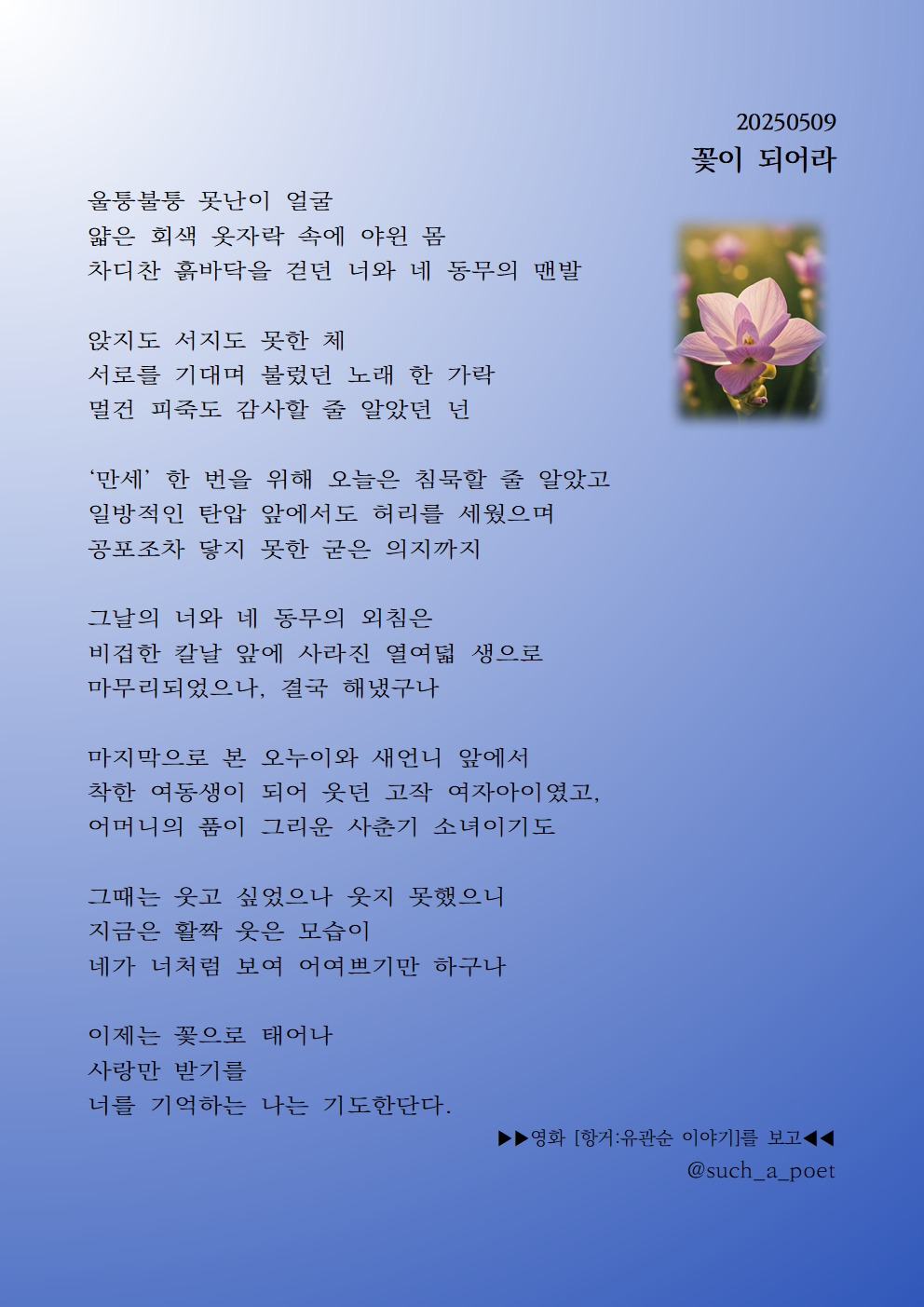 첨부된 꽃은 내가 제일 좋아하는 봄까치꽃이다. 아주 작지만, 생명력도 강하고 예쁜 들꽃이다. 오늘의 화자는 내가 그때였다면 엄두조차 못 냈을 3,1 만세운동 유관순 열사의 이야기이다. 그녀를 다룬 수많은 영화 중에서 유독 [항거;유관순 이야기]가 가장 와닿는 영화였다.