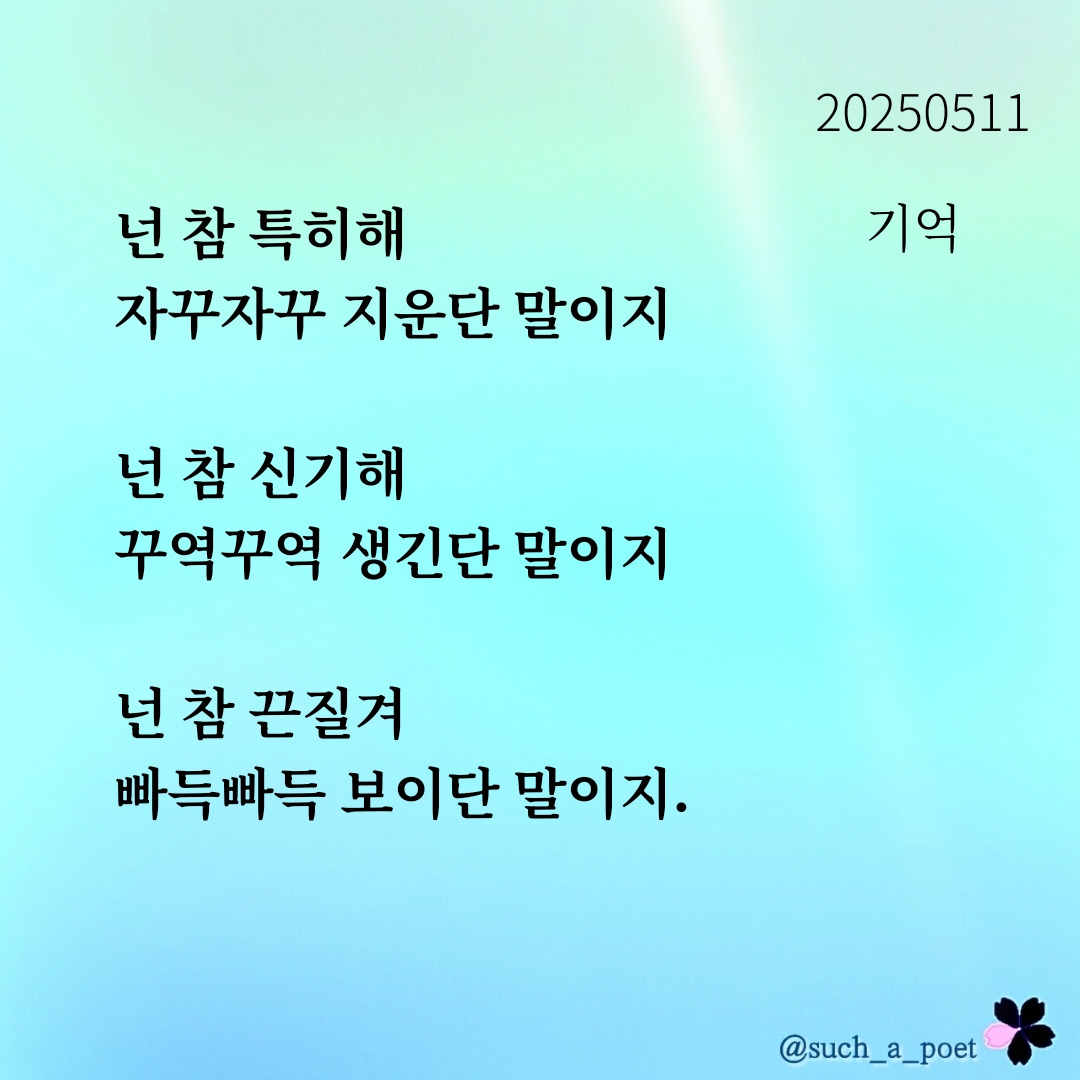어려운 문제 앞에 아이의 시선을 빌렸다. 그때는 그랬지. 웃으며 나를 위로한다. 이젠 내게 기억은 잊히고, 지워지고 있다. 다시 채워도 조금 남을 뿐이다. 서서히 더 많은 기억이 사라질지도 모른다. 하지만 괜찮다.